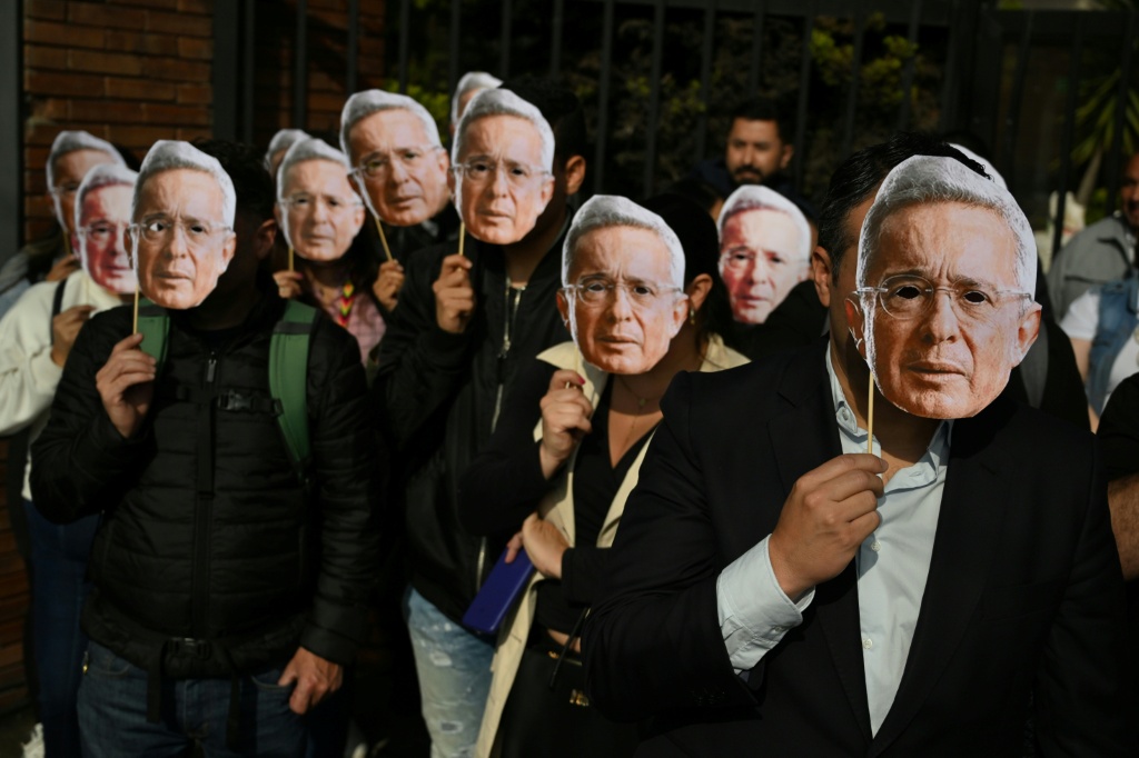 Decenas de sus simpatizantes se manifestaron durante su comparecencia en las afueras de los juzgados, portando banderas de Colombia y máscaras con el rostro del exmandatario.